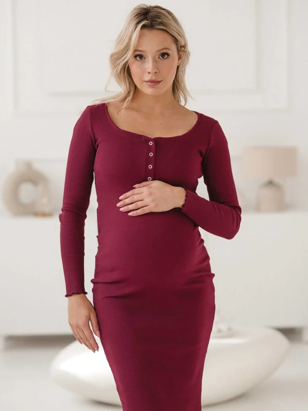 Nosečniška obleka za dojenje iz rebraste pletenine je izjemno udobna in ženstvena. Zahvaljujoč visokokakovostnemu materialu, ki se ne deformira in zagotavlja udobje pri nošenju, bo obleka za dojenje in nosečnost ostala z vami dolgo časa. Popolna osnovna nosečniška obleka ima oprijet kroj in gumbe na vratnem izrezu, kar omogoča prosto in diskretno dojenje. Udobne obleke za nosečnice/dojenje so popolne od prvega trimesečja, nosite jih lahko tudi po nosečnosti kot tradicionalne oprijete obleke. Nosečniška obleka je popolna tako za vsak dan kot za posebne priložnosti.