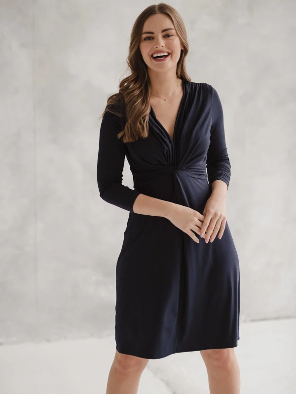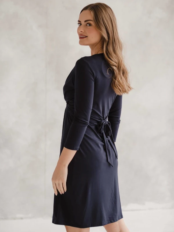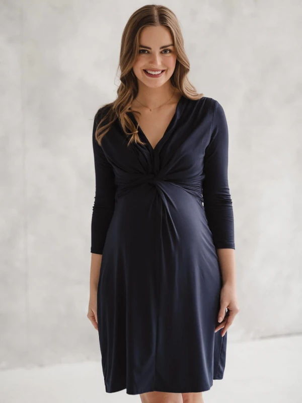 Kakovostna, popolna obleka za nosečnice iz elastične viskoze, ki se prilagaja rastočemu trebuščku. Obleka za bodoče mamice, ki vam omogoča prosto hranjenje otroka z nagibom vratnega izreza. Ta edinstvena nosečniška obleka ima všit pas, ki ga lahko popolnoma prilagodite vaši postavi tako med nosečnostjo kot po porodu. Ženstvena in modna nosečniška obleka iz kakovostnega viskoznega blaga, z lepim izrezom in okrasnim vozlom spredaj, daje bodoči in mladi mamici eleganten videz.
